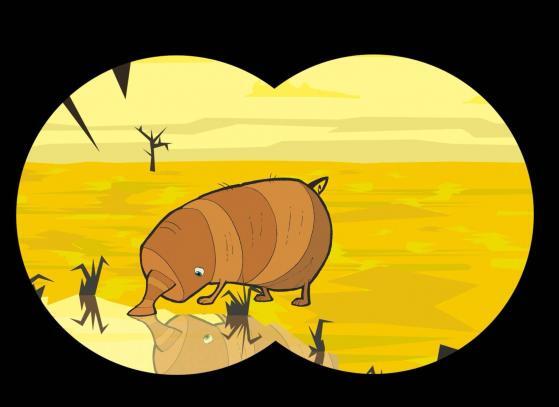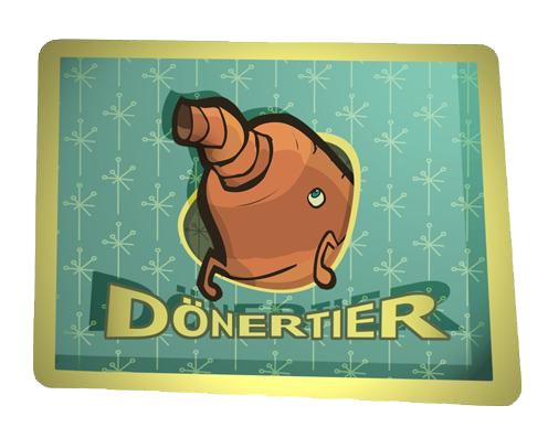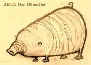 „Dönertier, das (animus doeneris): Das Dönertier gehört zur Spezies der ®Rumpf-Füßler. Sein Korpus besteht aus einzelnen, lose miteinander verbundenen Scheiben. Das Dönertier ernährt sich ausschließlich vegetarisch. Während der Sommermonate weidet es auf den Küstensteppen des Schwarzen Meeres auf der Suche nach reifen ®Energydrink-Früchten. Aufgrund seiner kleinen, weit auseinander stehenden Augen fehlt ihm jede dreidimensionale Sehkraft, so dass es dem Jäger in der Prärie eine leichte Beute ist. Im Winter zieht sich das Dönertier in seine Höhle zurück, wo es im eingefrorenen Zustand verharrt. Der Jäger bräuchte hier lediglich mit einer Frischhaltefolie bewaffnet die tiefgefrorenen Döner einsammeln, jedoch gilt diese Form der Dönerjagd als ehrlos und feige.“